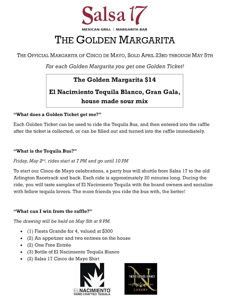 Then the Salsa 17 Tequila Bus is back and better than ever on Friday, May 2nd! Thanks to our friends at El Nacimiento Tequila and Next Level Limo, tequila will be flowing and rides will be rolling from 7-10 pm!